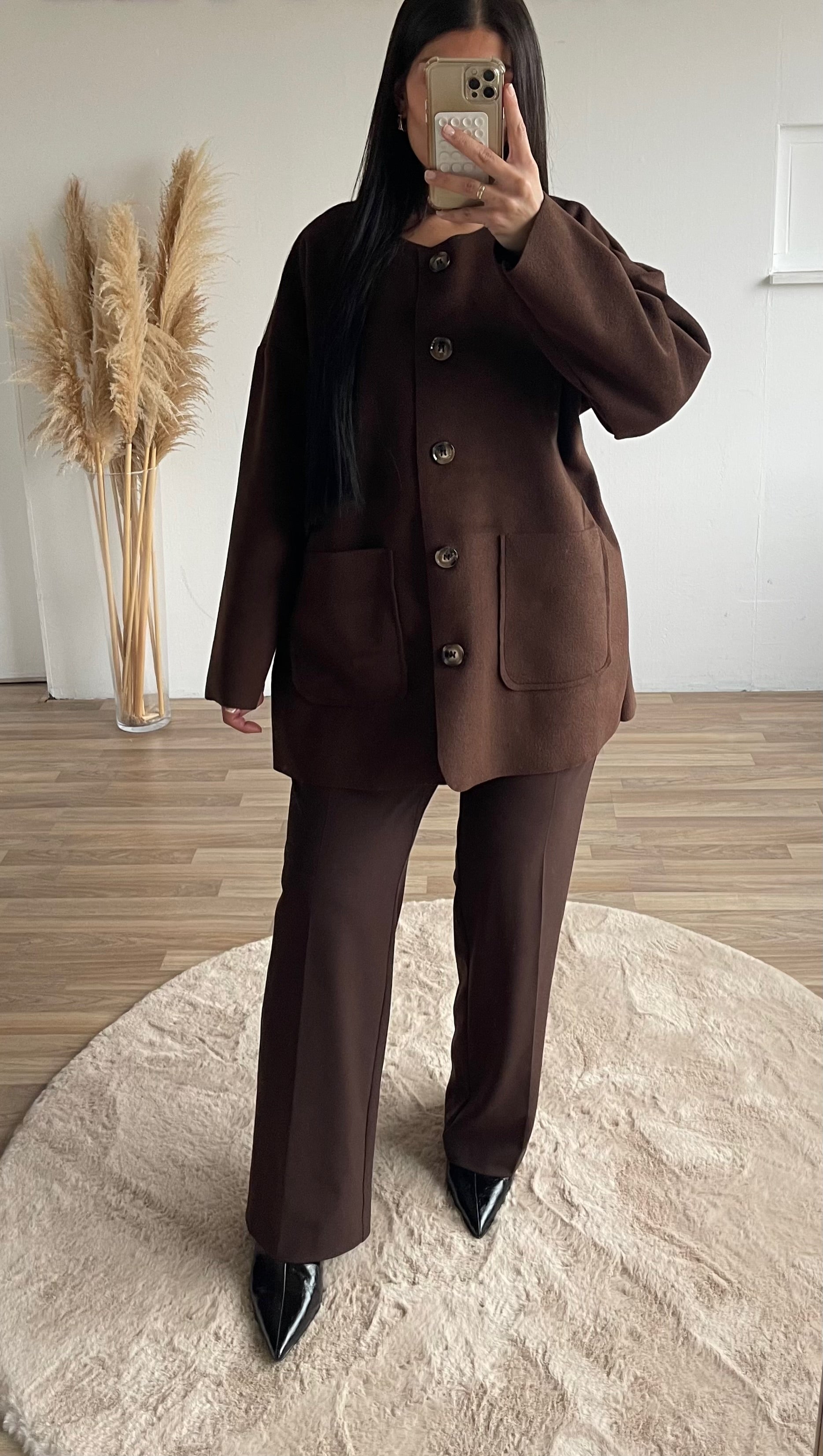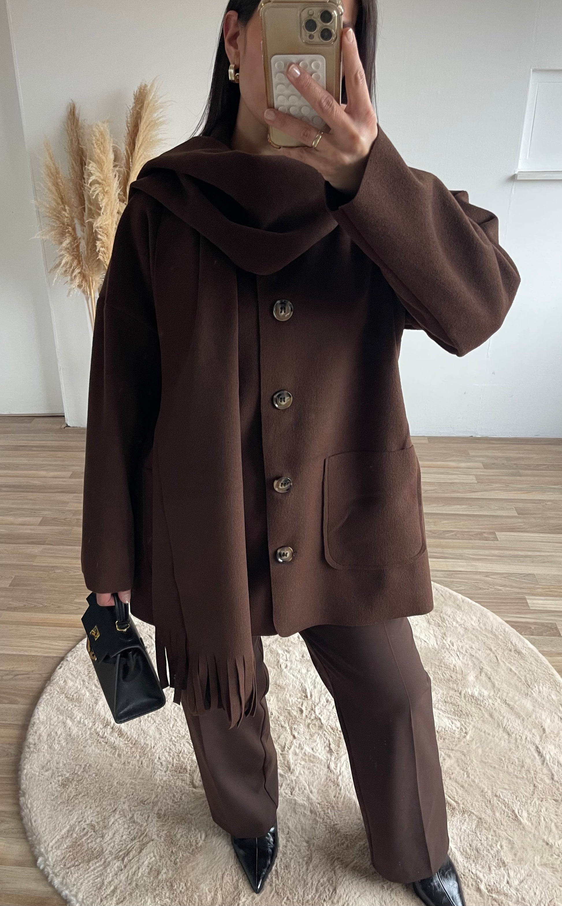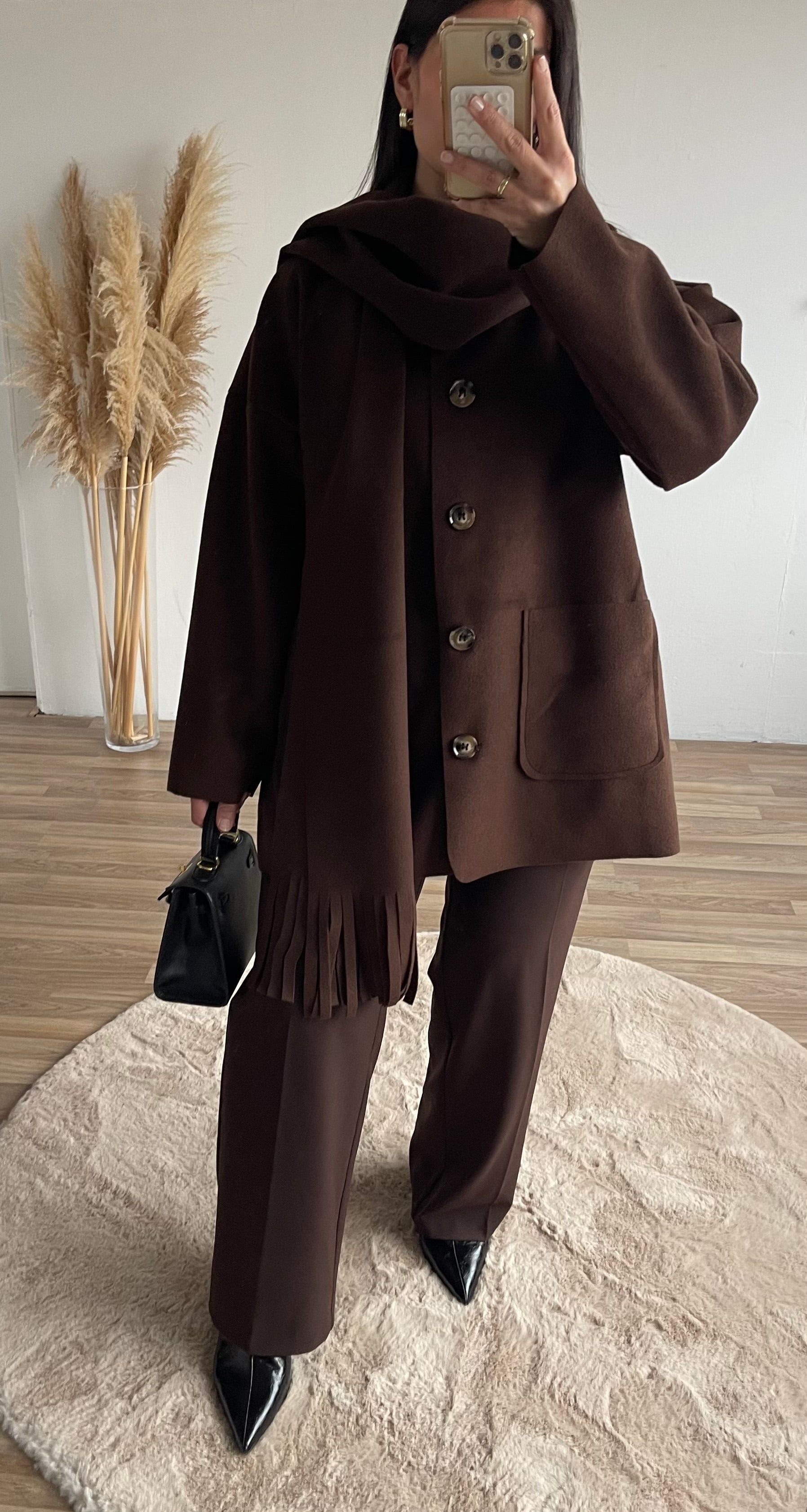 Onze Tessa jas is van zachte, gevilte kwaliteit met een afneembare sjaal. Het model heeft een ronde hals knoopsluitingen voor en 2 zakken aan beide kanten.