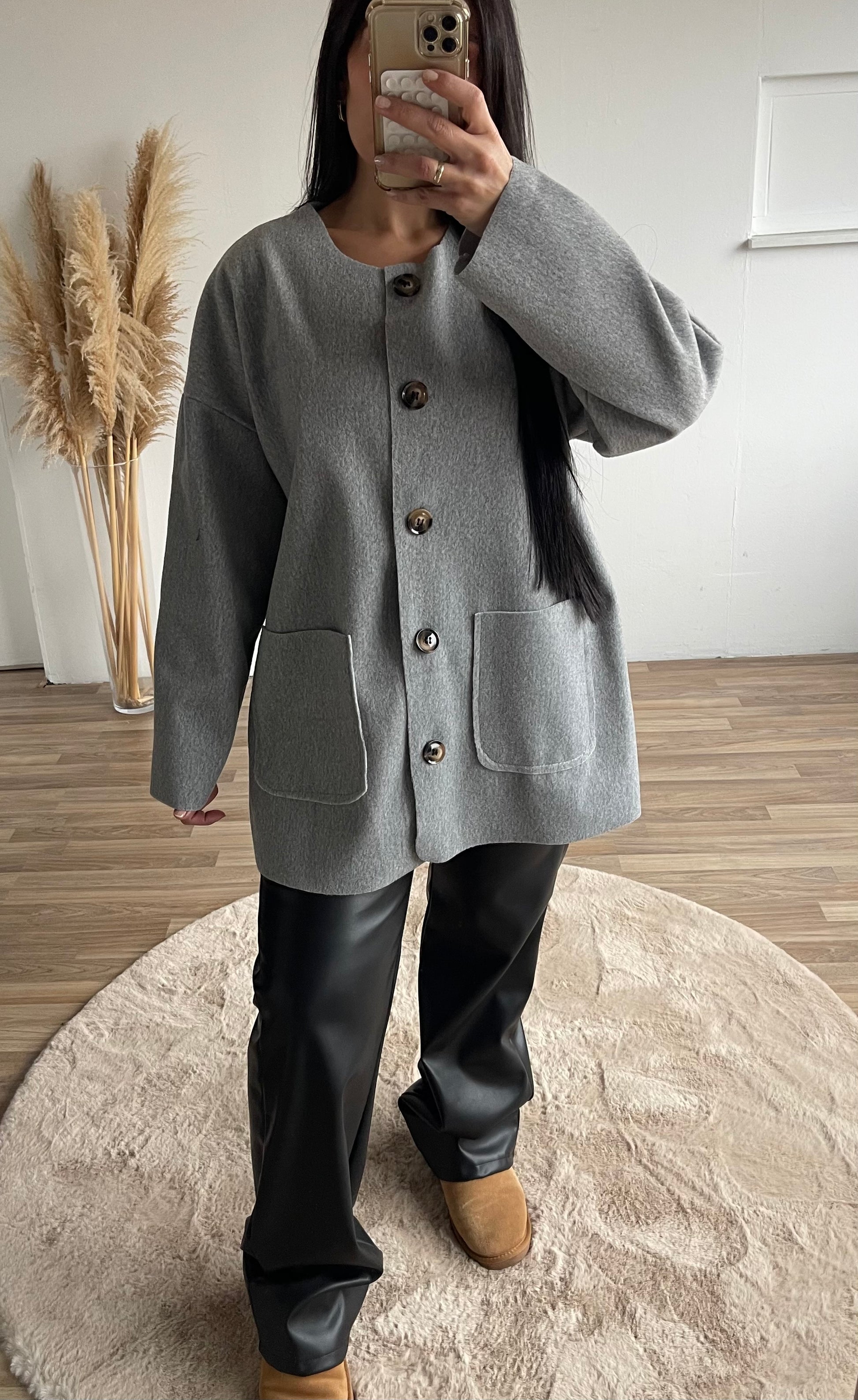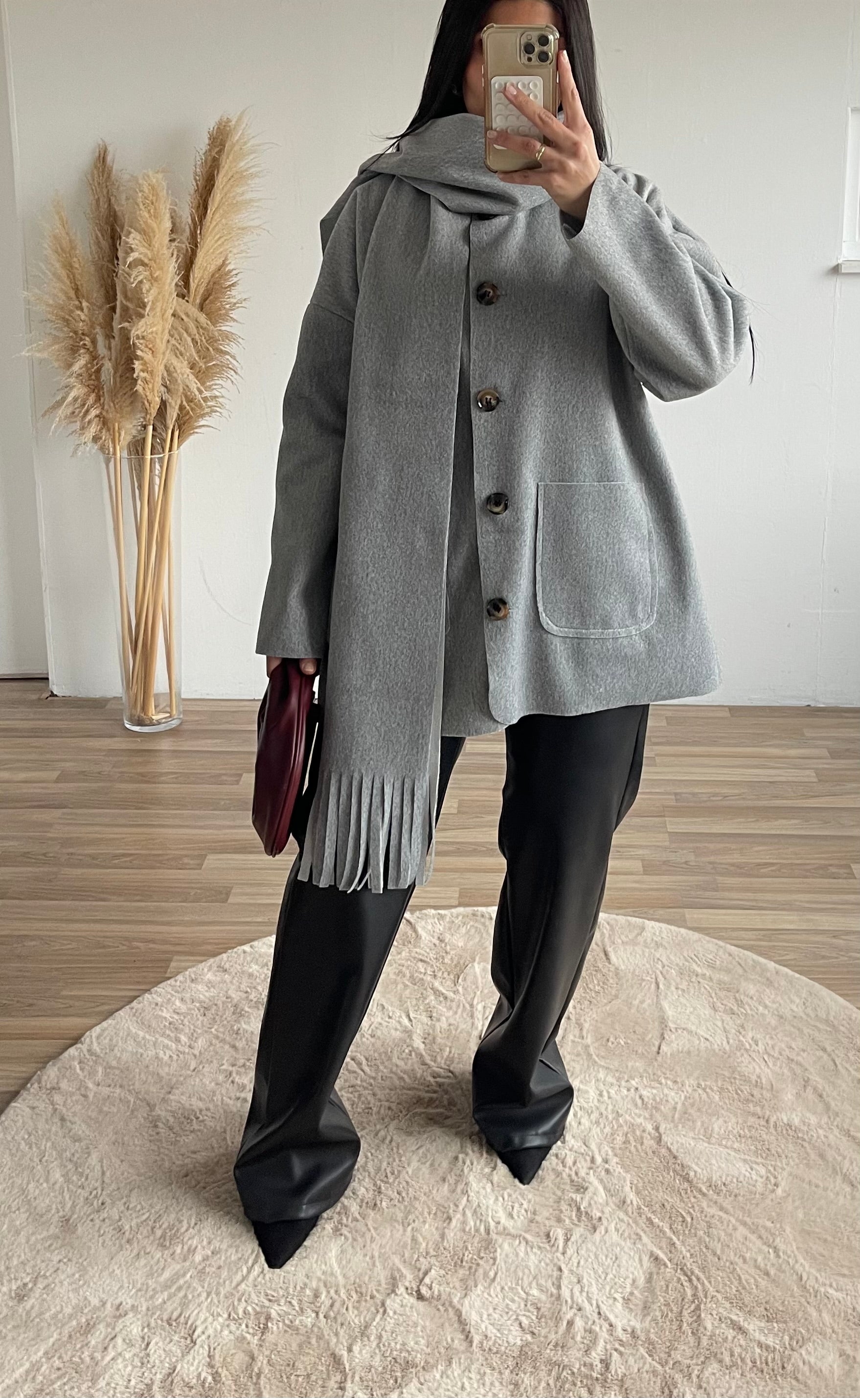 Onze Tessa jas is van zachte, gevilte kwaliteit met een afneembare sjaal. Het model heeft een ronde hals knoopsluitingen voor en 2 zakken aan beide kanten.